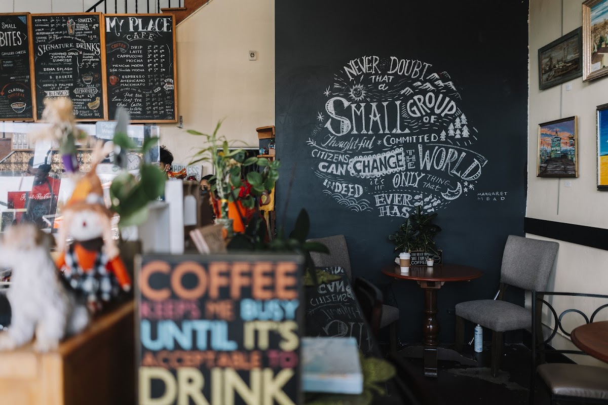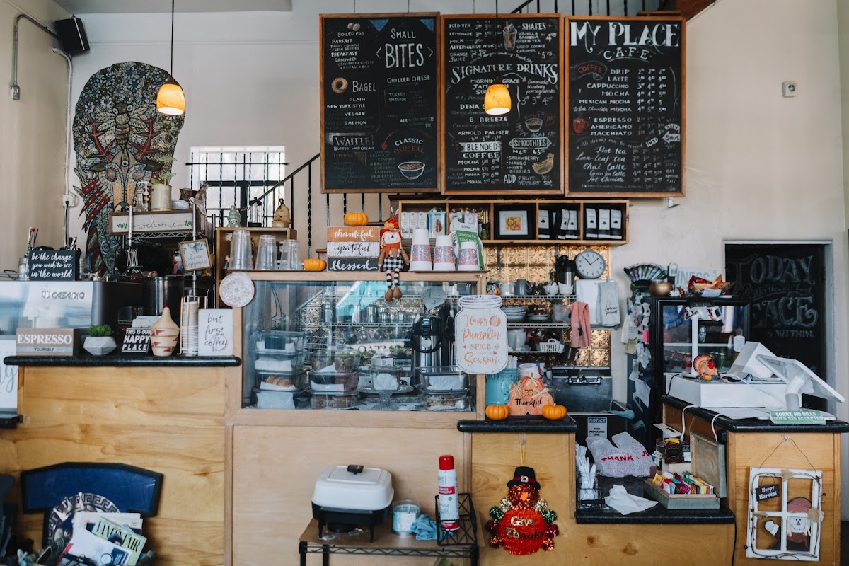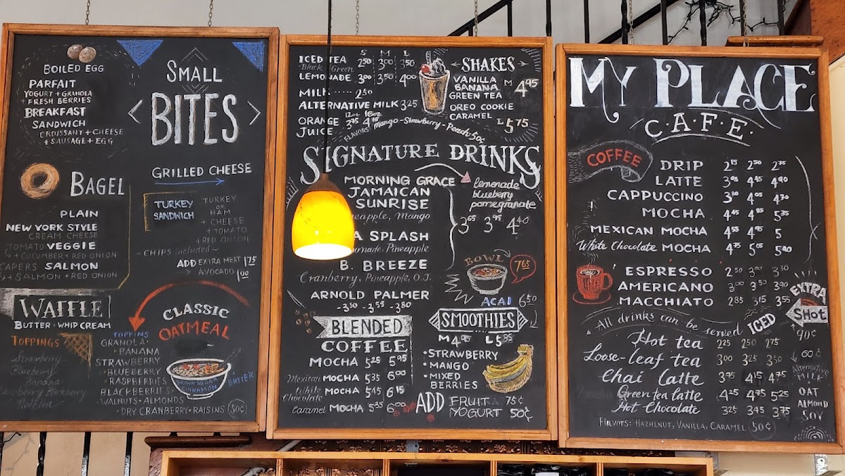 From a reviewer’s perspective, the menu at My Place Cafe offers a welcoming mix of refreshing drinks and classic café staples that balance comfort with variety. The Smoothies section features both the Peach Smoothie ($8.33) and the Mango Smoothie ($8.33), perfect for a fruity pick‑me‑up, while the Shakes category includes the creamy Oreo Shake ($8.33) and Vanilla Shake ($8.33) for a more indulgent treat. Coffee lovers will appreciate the Blended Coffees, with the rich Mocha ($7.67) and slightly sweeter Caramel Mocha ($7.62), alongside classic espresso bar options like Espresso ($4.75) and Cappuccino ($5.95) in the Hot Coffee & Tea lineup. For cooler weather or on the go, the Iced Coffee & Tea offerings include a straightforward Iced Coffee ($5.03) and a bold Americano ($6.13). These well‑priced beverages, from smoothies to specialty coffee, capture the café’s casual yet thoughtfully curated menu that keeps regulars returning for both everyday comfort and occasional treats.